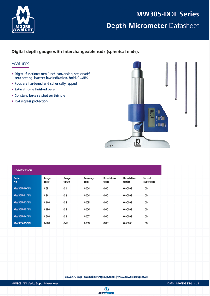 Digital Depth Micrometer by Moore & Wright comes complete with hardened and spherically lapped interchangeable rods.