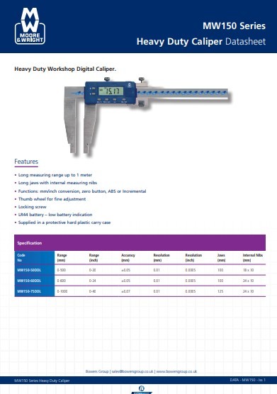 | MW150-75DDL | 0-1000 | 0-40 | ±0.07 | 0.01 | 0.0005 | 125mm | 24 x 10mm | £635.00 |