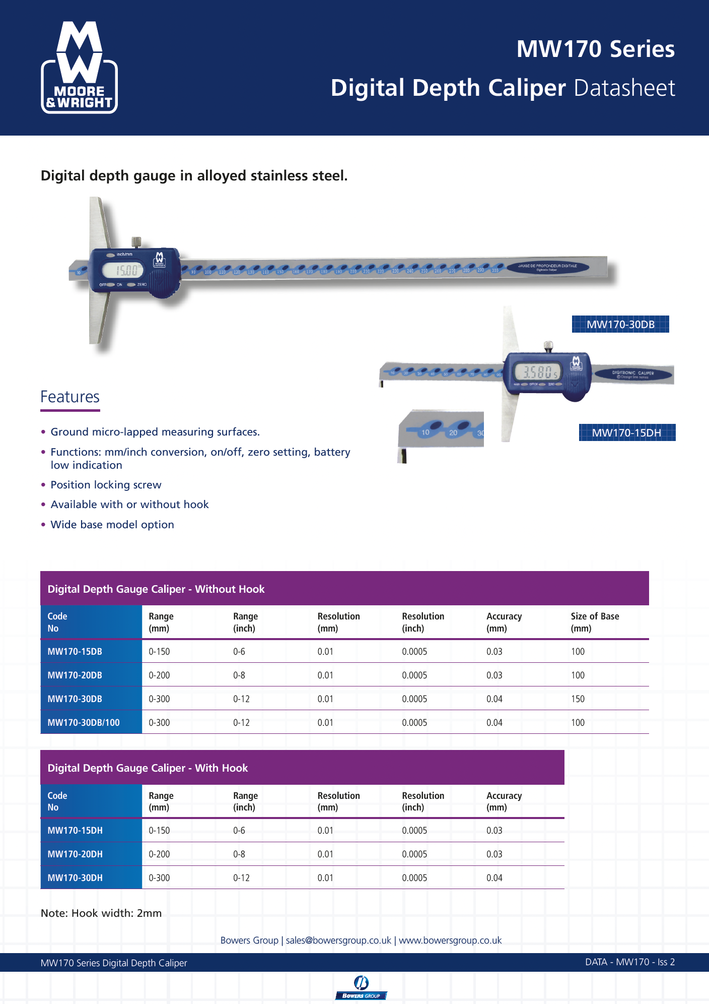 Moore & Wright Digital Depth Caliper 170-DB/DH Series Ground micro-lapped measuring surfaces.