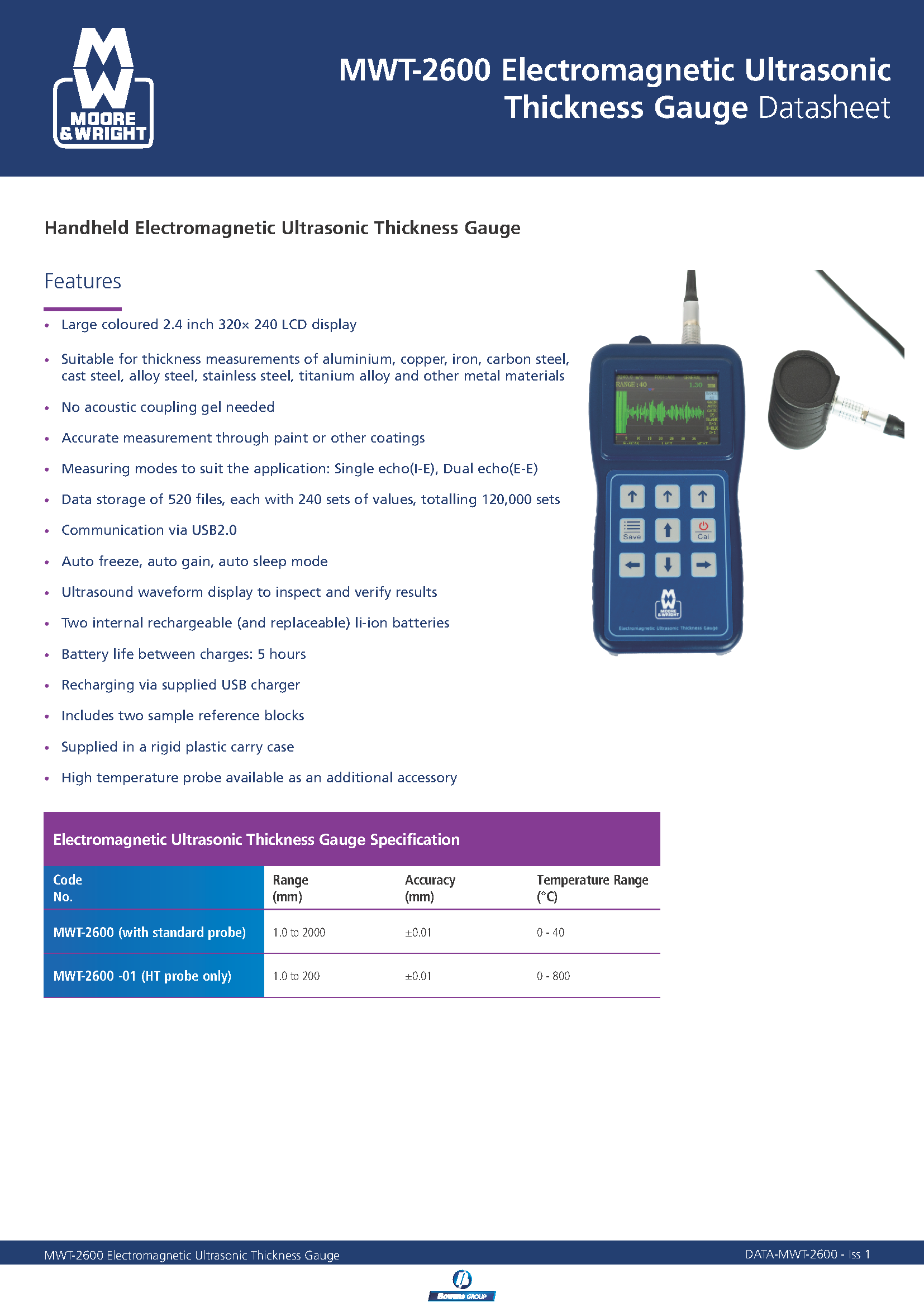 The Moore & Wright MWT-2600 is a highly accurate Electromagnetic Ultrasonic Thickness Gauge used to measure the thickness of conductive materials without the need for direct contact or coupling gels. It uses the Single Echo or Dual Echo method to measure the behaviour of ultrasonic waves as they radiate through a material and reflect back to the surface.