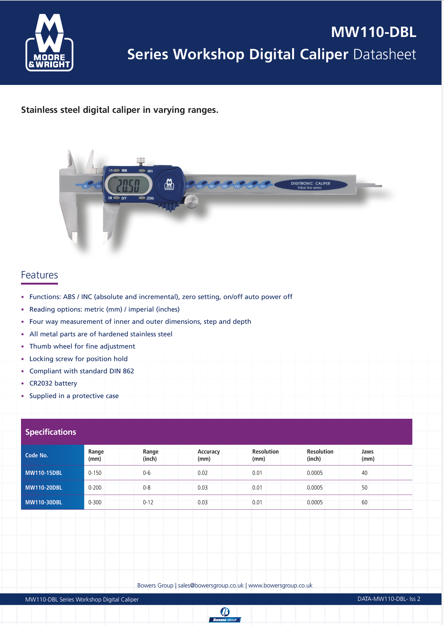 MW110-20DBL | 0-200 | 0-8 | 0.03 | 0.01 | 0.0005 | 50mm | £111.00 |