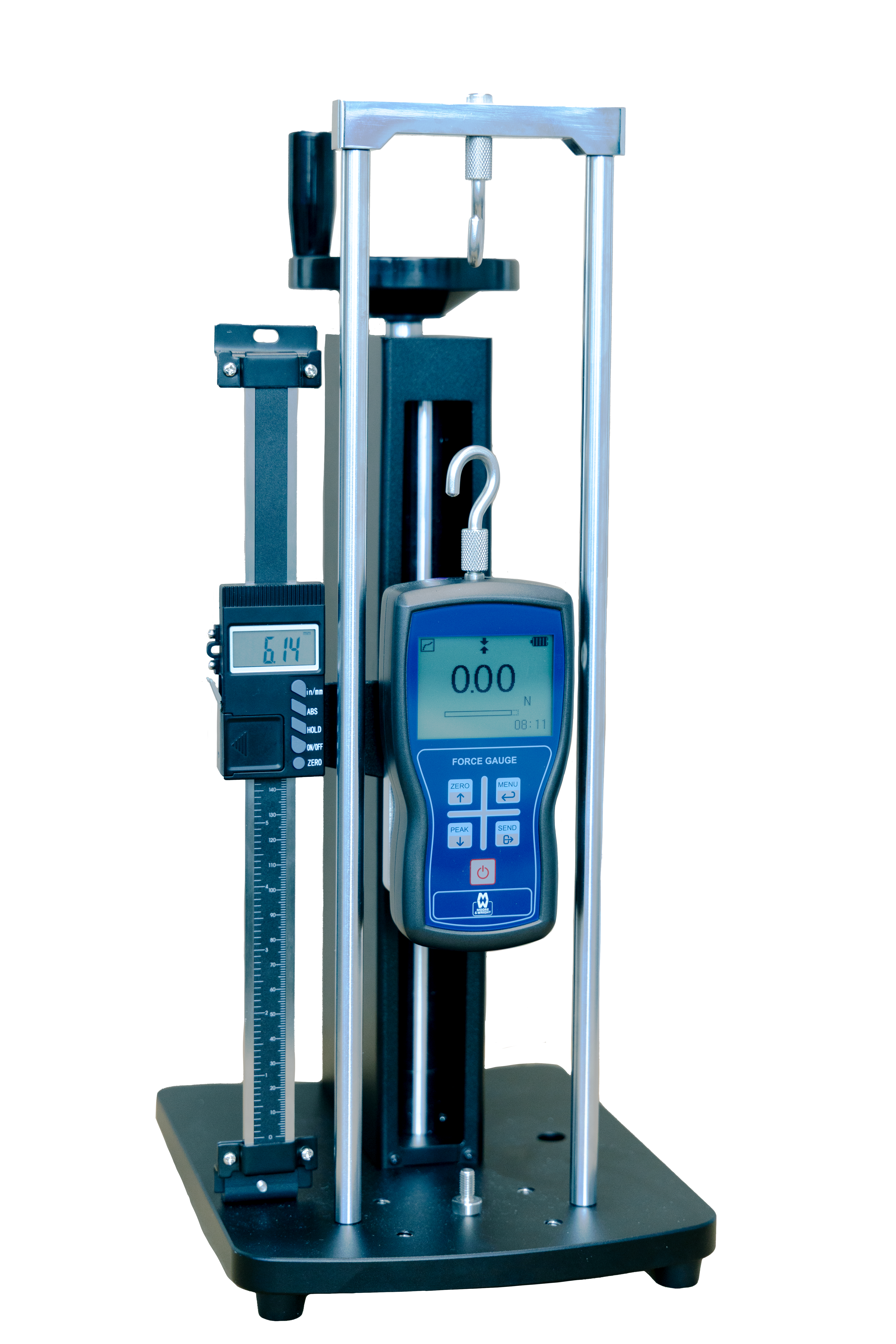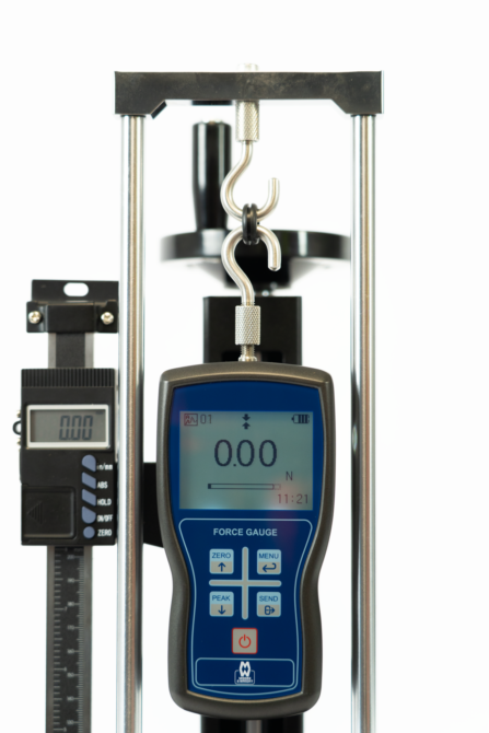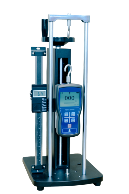 The Test Stand is equipped with a digital scale to accurately measure the Force Gauge's travel during tests, providing data for Force-Displacement measurements and allowing for further analysis of material properties.