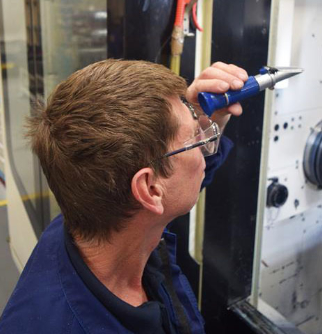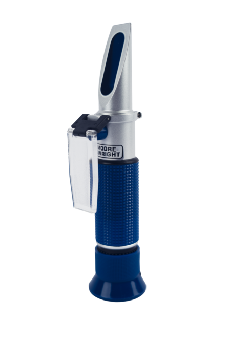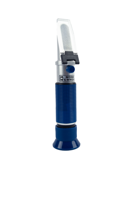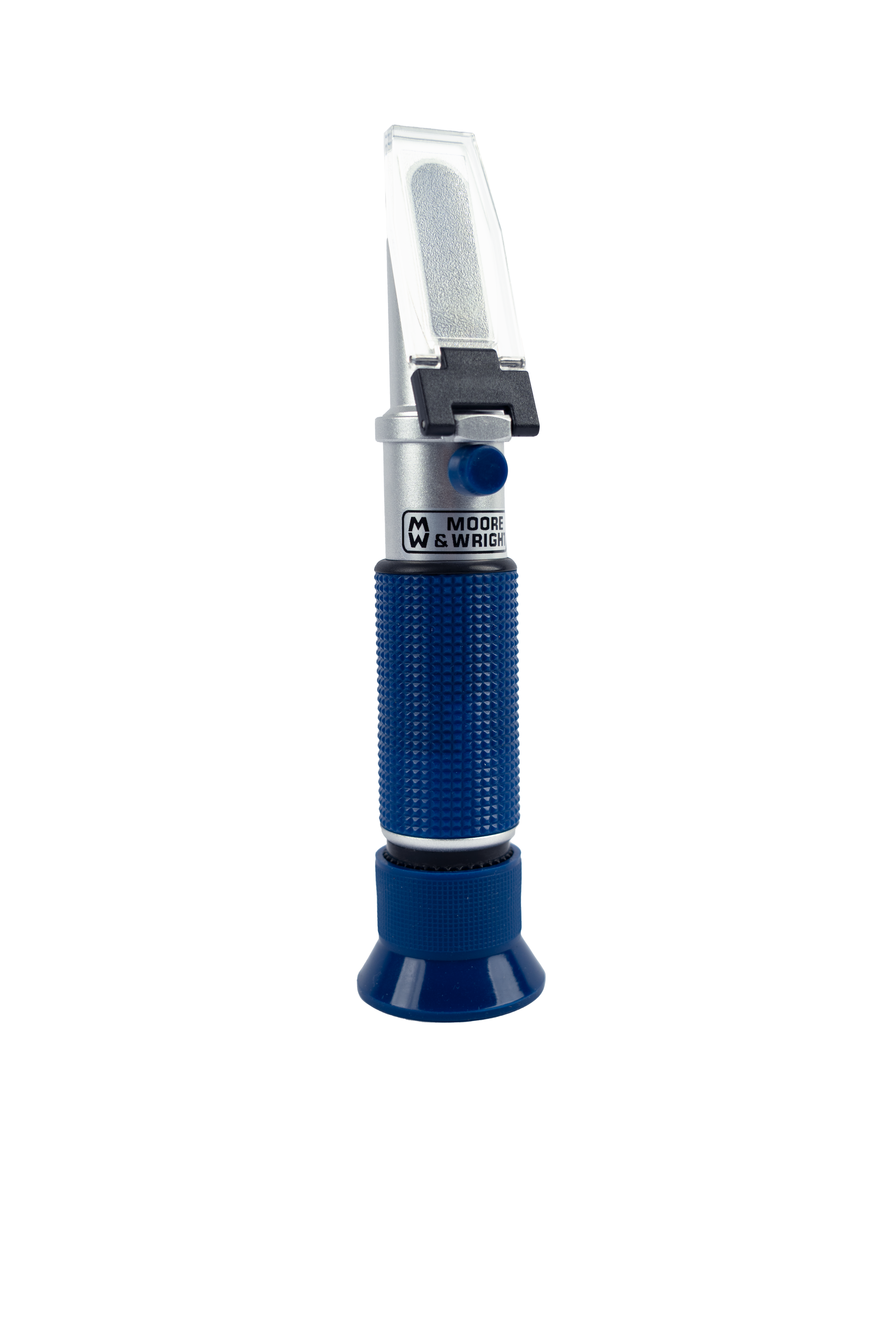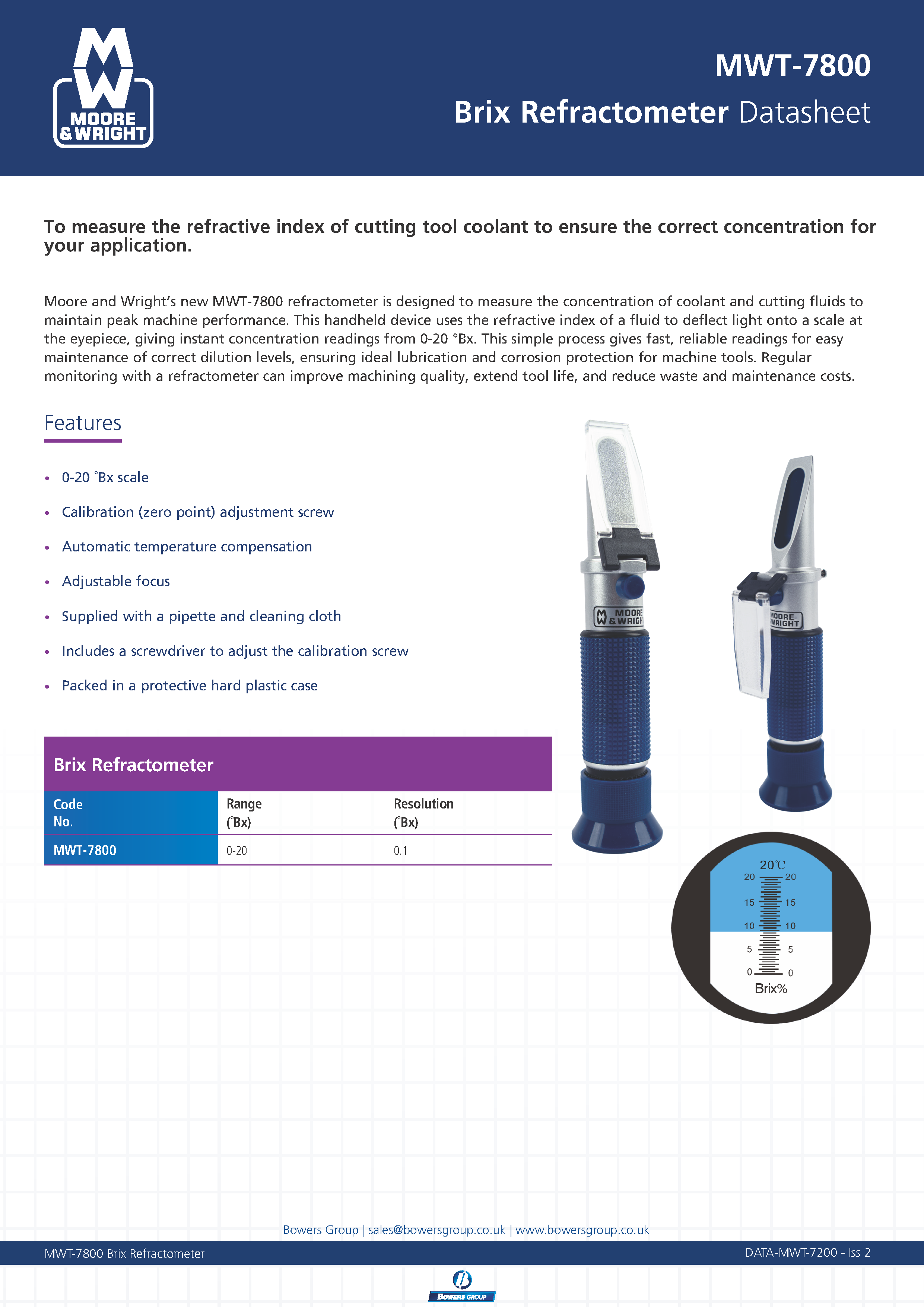 Moore and Wright’s MWT-7800 refractometer is designed to measure the concentration of coolant and cutting fluids to maintain peak machine performance. This handheld device uses the refractive index of a fluid to deflect light onto a scale at the eyepiece, giving instant concentration readings from 0-20 °Bx. This simple process gives fast, reliable readings for easy maintenance of correct dilution levels, ensuring ideal lubrication and corrosion protection for machine tools. Regular monitoring with a refractometer can improve machining quality, extend tool life, and reduce waste and maintenance costs.